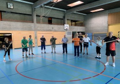 Feierstunde auf der Herzseite. Dem Vierten im Bunde, Herrn Fischer van Bracht, heute nicht dabei, wird es in der nächsten Übungsstunde übergeben. ( Überreichen der Hemden,